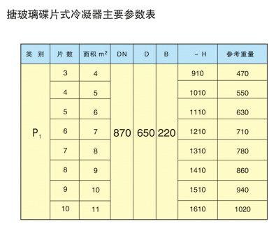 1、搪玻璃碟片式冷凝器分P1型及PO. 5型两种型号。伶凝面积P0.5型,每片为0.5㎡,设备外径为700mmo P1型,每片冷凝为1㎡,设备处径为960mm。定型规格为1. 5-15㎡系列,可根据所需冷凝量来选择。